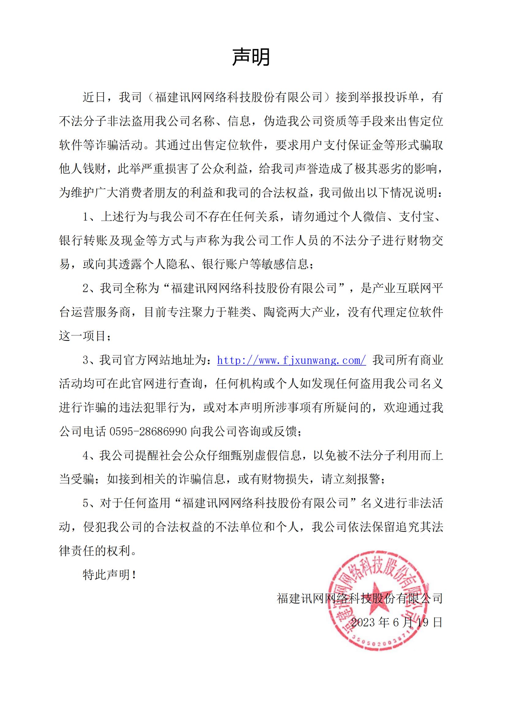 近日,我司(福建訊網網絡科技股份有限公司)接到舉報投訴單,有不法分子非法盜用我公司名稱、信息,偽造我公司資質等手段來出售定位軟件等詐騙活動。其通過出售定位軟件,要求用戶支付保證金等形式騙取他人錢財,此舉嚴重損害了公眾利益,給我司聲譽造成了極其惡劣的影響,為維護廣大消費者朋友的利益和我司的合法權益,我司做出以下情況說明: