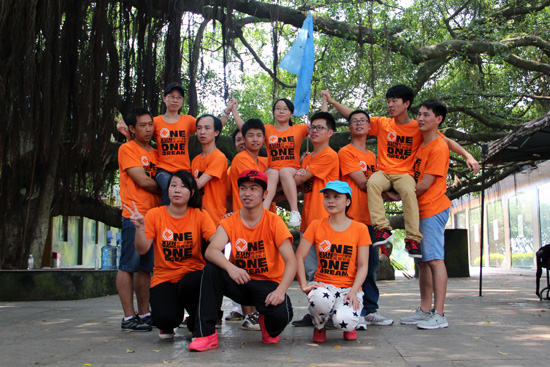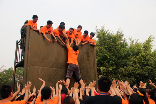 這兩個項目完成后,我們的大團(tuán)隊來到了操場,拍了集體照,各個公司和各個小隊也分別拍了照片。隨著留影紀(jì)念結(jié)束,最后一個項目,也是讓人印象最深刻的一個項目到來了。畢業(yè)墻,也叫“夢想之墻”。所有人,不能借助任何道具,單純依靠身體的力量,要全部爬上4.7米高的鐵墻。一馬當(dāng)先的隊員、甘當(dāng)人柱的隊員、奮力抓取的隊員、默默守護(hù)的隊員和幾乎沒有任何可以依靠的最后一名隊員。每個人都在這個項目里找到了自己的角色,并順利地完成了自己的使命。當(dāng)最后一名隊員——黃永星童鞋爬上了夢想墻后,歡呼聲、鼓掌聲頓時響徹每個人耳邊。