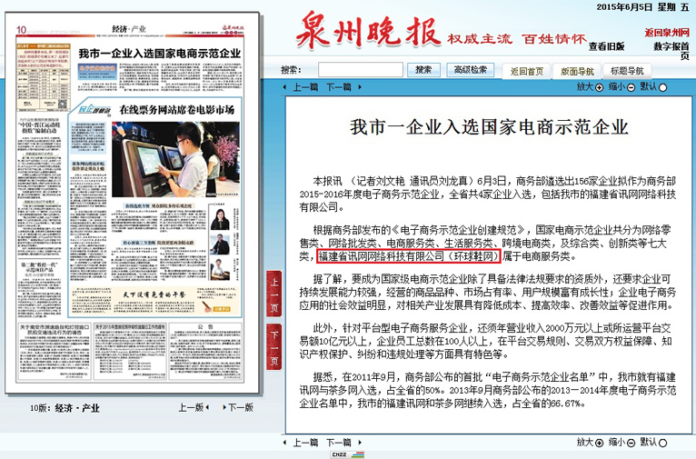 (泉州晚報訊)6月3日,商務(wù)部遴選出156家企業(yè)擬作為商務(wù)部2015-2016年度電子商務(wù)示范企業(yè),全省共4家企業(yè)入選,包括我市的福建省訊網(wǎng)網(wǎng)絡(luò)科技有限公司。
