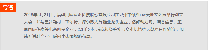 2016年5月21日,福建訊網網絡科技股份有限公司在泉州市領Show天地文創園舉行創立大會,并與星達鞋材、琪爾特、德爾激光等鞋業龍頭企業,億邦動力網、清谷信息、正點國際傳媒等電商明星企業,宏山資本, 瑞贏投資等實力資本機構簽署戰略合作協議,加速推進鞋產業互聯網生態圈戰略布局。