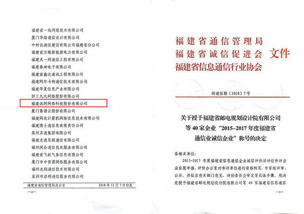 訊網榮獲“2015-2017年福建省信息通信業誠信企業”