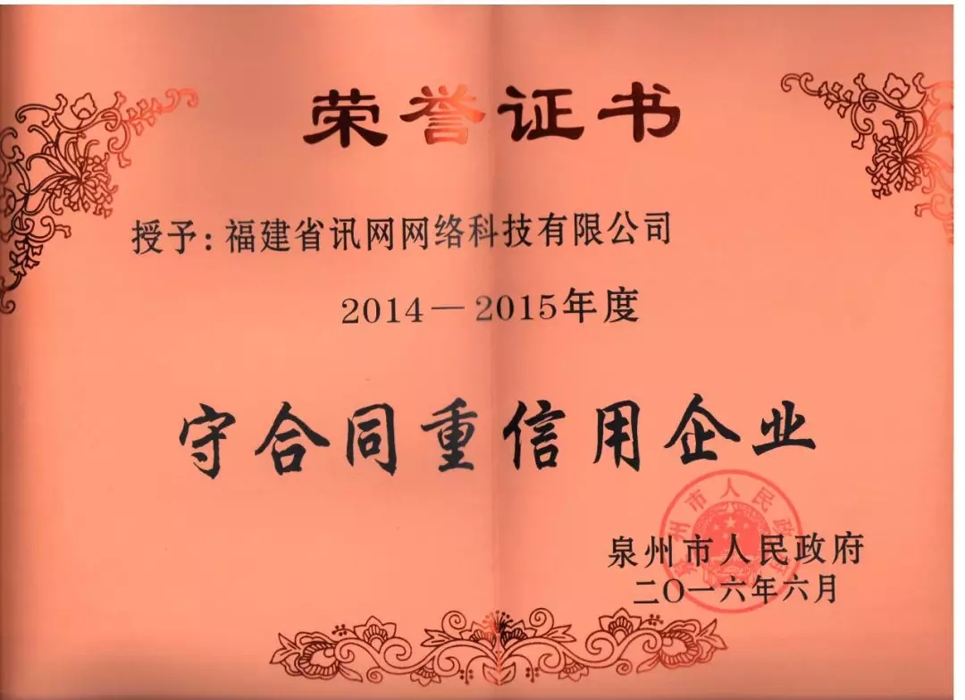 “守合同重信用”企業評選活動,是泉州市工商行政管理局開展的旨在推進企業誠信建設,規范企業合同行為,引導企業誠信履約、守法經營的行政指導活動,是社會信用體系的重要組成部分。獲評企業在守法經營、文明經營、誠信經營等方面表現突出,有力詮釋了合同規范與商業信用在企業發展中的核心價值。該國家級評選活動自開展以來受到廣大企業的重視,社會認可度高。再次榮獲“泉州市守合同重信用企業”,是社會各界對訊網網絡多年誠信經營的肯定。