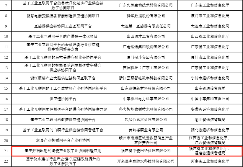 日前,工信部發(fā)布了2023年工業(yè)互聯(lián)網(wǎng)試點(diǎn)示范名單,愛陶瓷平臺(中瓷網(wǎng)絡(luò))憑借“基于數(shù)據(jù)驅(qū)動的陶瓷產(chǎn)業(yè)數(shù)字化協(xié)同制造應(yīng)用”成功入選工業(yè)互聯(lián)網(wǎng)平臺+產(chǎn)業(yè)鏈/供應(yīng)鏈協(xié)同試點(diǎn)示范,祝賀!