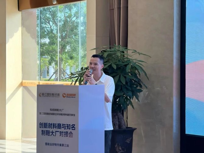 環(huán)球鞋網(wǎng)代表主辦方為大家一一介紹了本次對(duì)接會(huì)的創(chuàng)新材料商:康邦拓、佳南、鍇越、扭嗒、亞塑、華宇、中盛、炫龍、恒得利、泉榮。