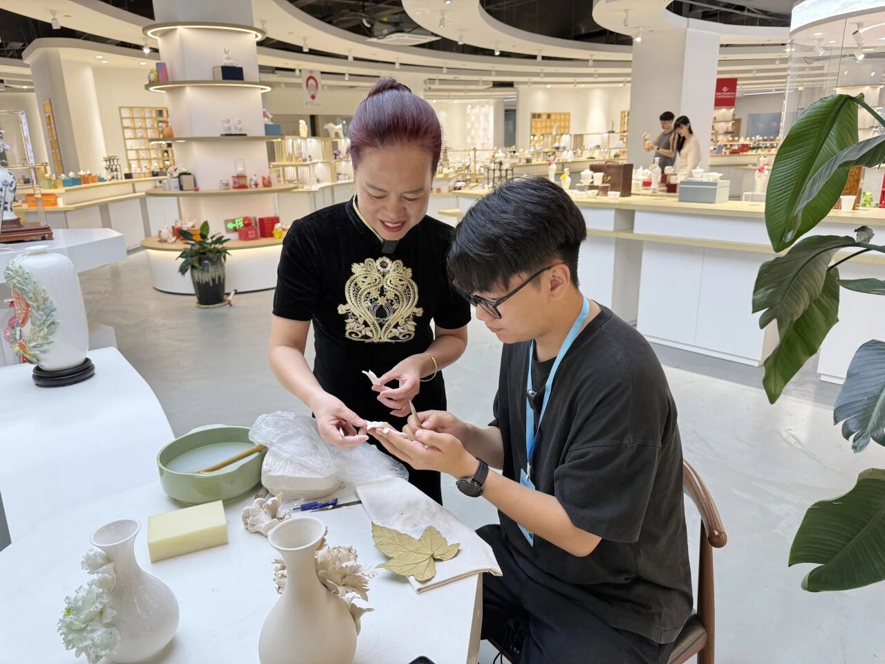非遺手捏花傳承人查彩端現(xiàn)場(chǎng)演示德化瓷花創(chuàng)作過(guò)程,展現(xiàn)了精湛的傳統(tǒng)技藝。止余齋品牌主理人余麗萍老師以釉下青花手繪工藝,創(chuàng)作出兼具實(shí)用價(jià)值和藝術(shù)收藏價(jià)值的德化青花玉瓷作品。