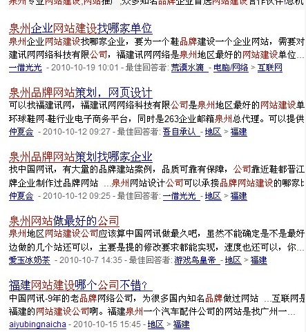 在百度搜索中,我們通過輸入“泉州品牌/企業(yè)網(wǎng)站建設(shè)”,可以直觀的看到顯示的以下信息: