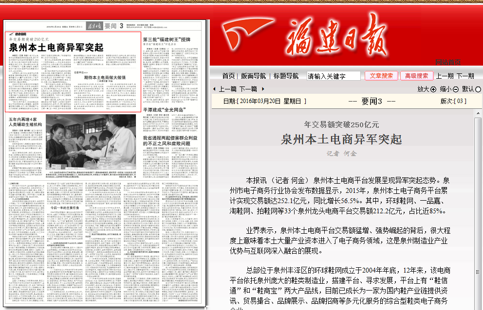 本報(bào)訊(記者何金)泉州本土電商平臺(tái)發(fā)展呈現(xiàn)異軍突起態(tài)勢(shì)。泉州市電子商務(wù)行業(yè)協(xié)會(huì)發(fā)布數(shù)據(jù)顯示,2015年,泉州本土電子商務(wù)平臺(tái)累計(jì)實(shí)現(xiàn)交易額達(dá)252.1億元,同比增長(zhǎng)56.5%。其中,環(huán)球鞋網(wǎng)、一品嘉、淘鞋網(wǎng)、拍鞋網(wǎng)等33個(gè)泉州龍頭電商平臺(tái)交易額212.2億元,占比近85%。..